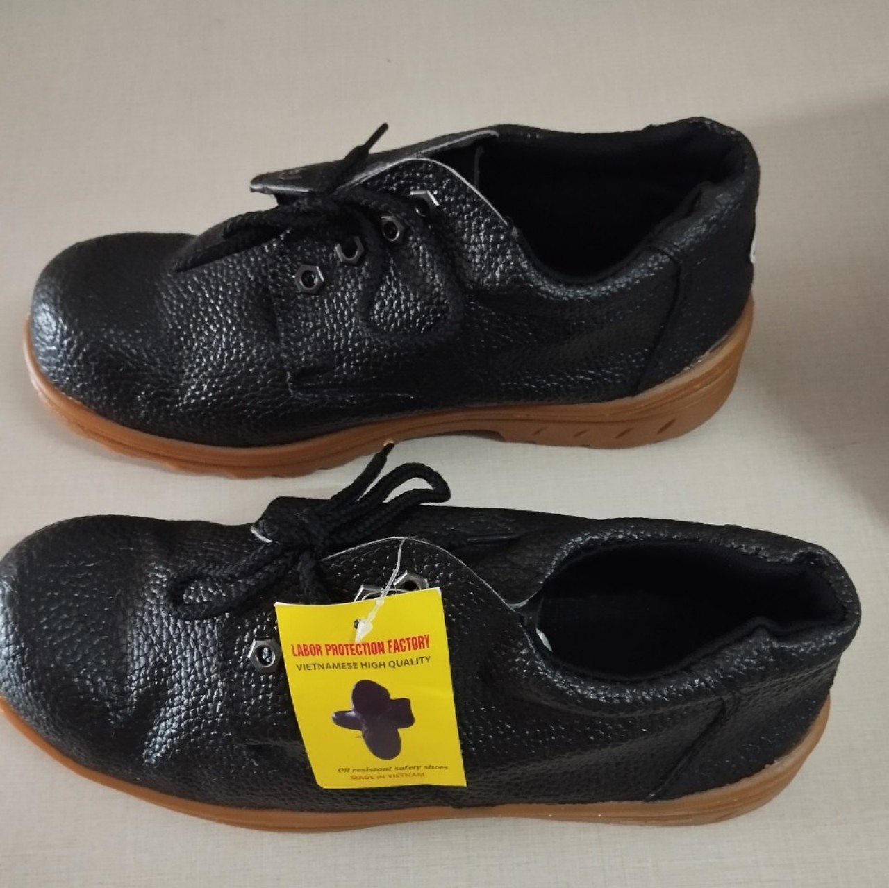 Chất liệu: thân dày bằng da phun; mũi dày bằng thép chống va đập; miếng lót đế bằng thép chống đâm xuyên; đế giày bằng PVC chống dầu, axit, chống trơn trượt